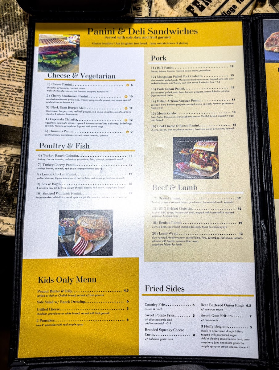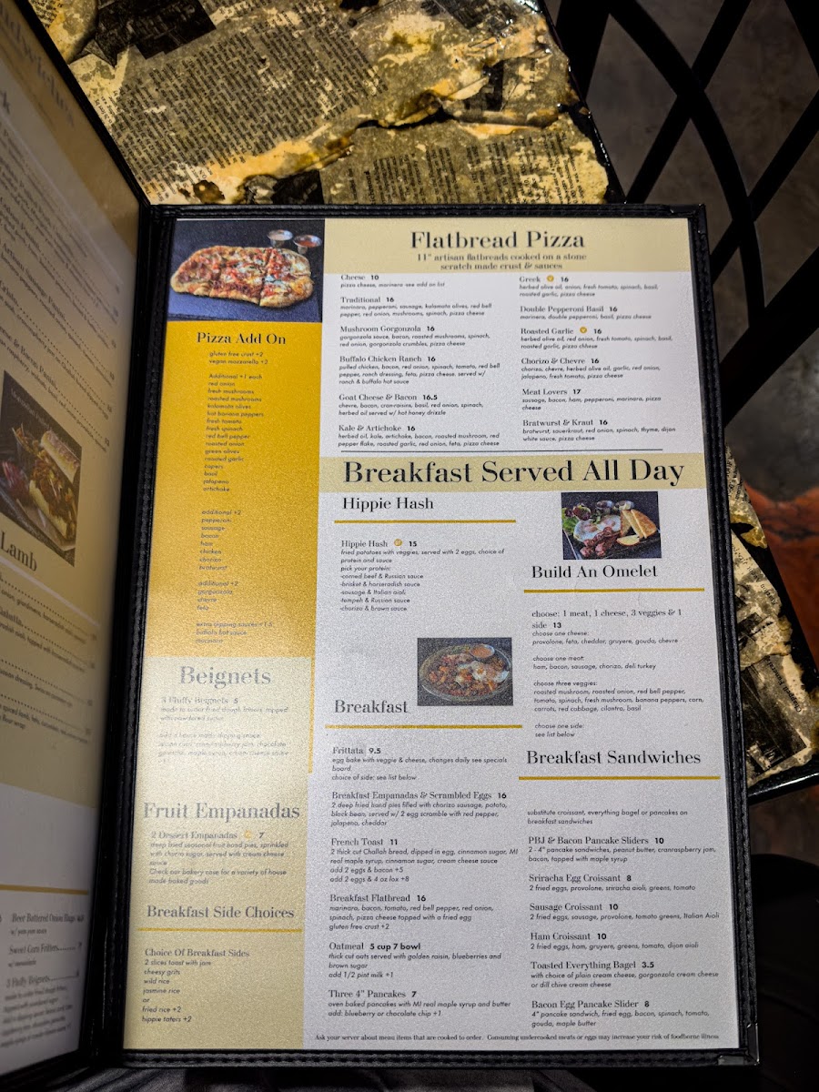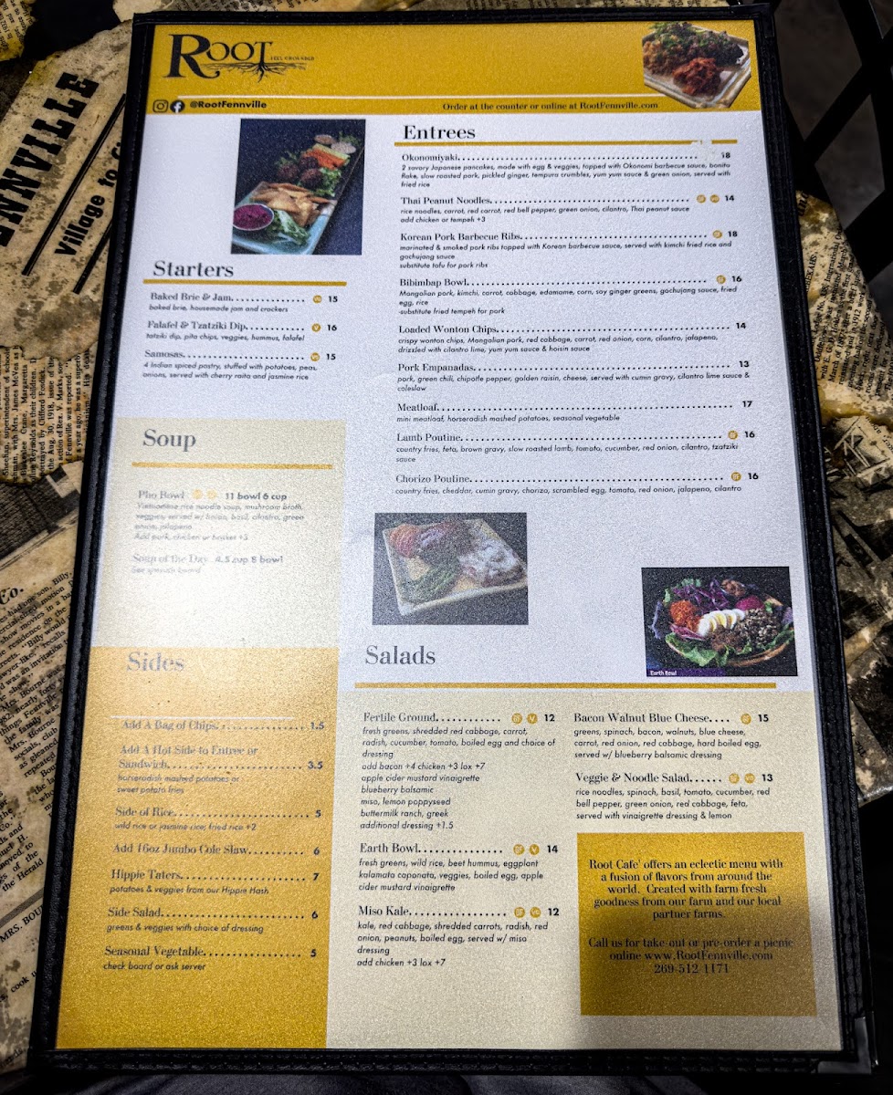 From a reviewer’s perspective, the menu at Root Cafe - Fennville feels like a thoughtful wrap-up of comfort food, global inspiration, and café classics, all designed to satisfy a wide range of cravings. The Flatbread Pizza selection stands out with creative options like 10" Cheese, 10" Traditional, 10" Greek, 10" Roasted Mushroom Gorgonzola, and 10" Buffalo Chicken Ranch, offering both familiar flavors and bolder combinations. Moving into handheld favorites, the Grilled and Deli Sandwiches-including Cheese, Ultimate Grilled Cheese, Spanakopita Panini, Cheesy Mushroom Panini, and Black Bean Burger Melt Panini-show a clear focus on rich, melty textures and vegetarian-friendly variety. The section titled Tacos, Salads & Not the Normal truly lives up to its name, featuring diverse dishes such as Samosas, Loaded Wonton Chips, Pork Empanadas, Bibimbap, and Fried Tempeh Sticks, which add an adventurous, international edge to the menu. For those who enjoy classic bar-style bites, the Fried Appetizers-from Country Fries and Sweet Potato Fries to Battered Banana Pepper Rings, Breaded Squeaky Cheese Curds, and Beer Battered Onion Rings-deliver satisfying crunch and shareable appeal. Breakfast offerings like Sriracha, Ham & Cheddar, Sausage & Ham, Ham Crepe, and Turkey Feta Crepe round out the menu with hearty morning options that feel just as comforting as the lunch and dinner items. Finally, the experience is completed with Beverages and Ice Cream, including Coffee, Espresso & Tea, Adult Beverages, Soda and Refrigerated Beverages, Smoothies, and Blended Frozen Coffee, ensuring there’s something to sip alongside every meal. Overall, the menu comes together as a well-balanced, flavorful conclusion that highlights Root Cafe’s creativity, inclusiveness, and casual charm.
